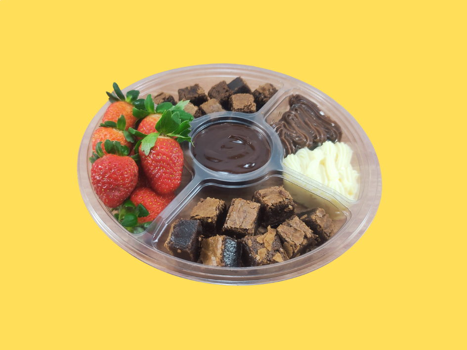 Aqui você encontra uma petisqueira de dar água na boca, irresistível para comer em dupla ou até em trio. Com aprox.: 360g, muito bem servida com 100g de recheio cremoso a sua escolha (chocolate e Ninho), 140g de brownie macio e bem chocolatudo, 80g de morangos frescos, e no centro 40g de ganache de chocolate meio amargo ou ganache branca, podendo trocar por 40g de Nutella pura.