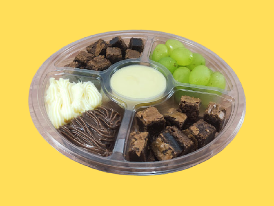 Aqui você encontra uma petisqueira de dar água na boca, irresistível para comer em dupla ou até em trio. Com aprox.: 360g, muito bem servida com 100g de recheio cremoso a sua escolha (chocolate e Ninho), 140g de brownie macio e bem chocolatudo, 80g de uvas verdes sem caroço, e no centro 40g de ganache de chocolate meio amargo ou ganache branca, podendo trocar por 40g de Nutella pura.